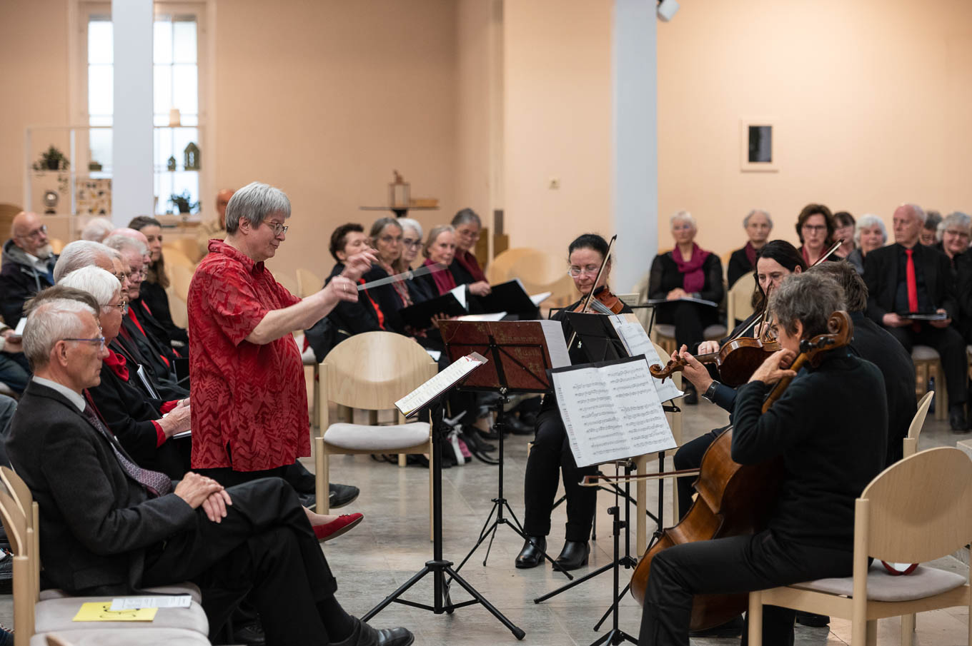 Zwischen den Chorsätzen, teilweise a cappella, teilweise mit Instrumentenunterstützung gesungen, spielte das Streichensemble Schuster in brillanter Weise das Mozartquartett in D-Dur KV 285 mit der Querflötistin Ortrun Kestel und das Telemann-Konzert G-Dur mit Fred Schuster als Violasolist.